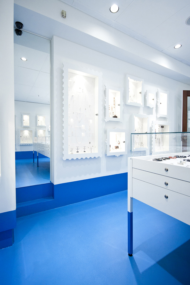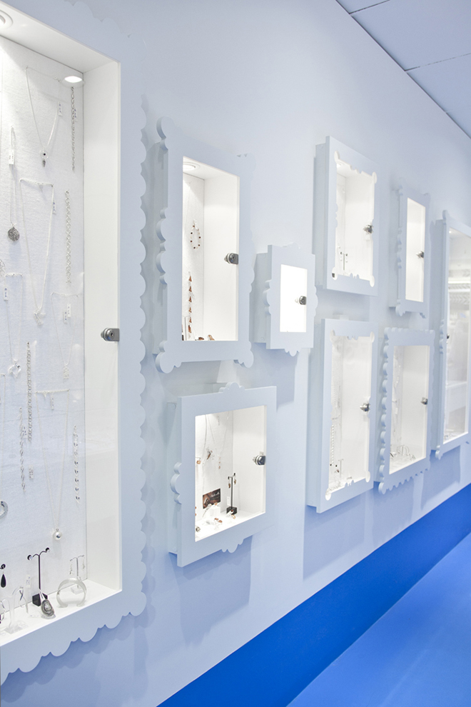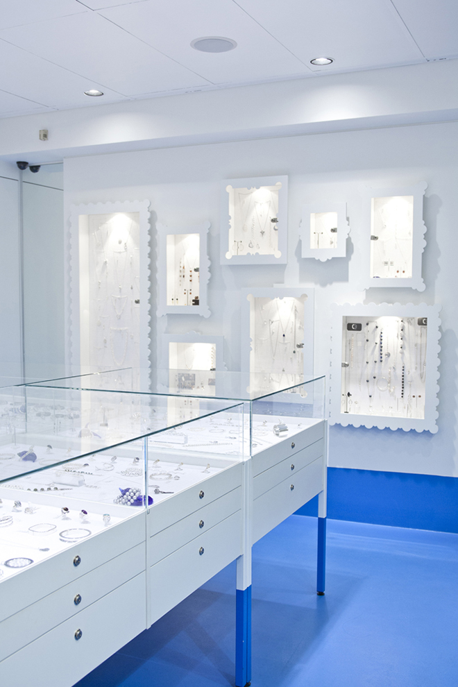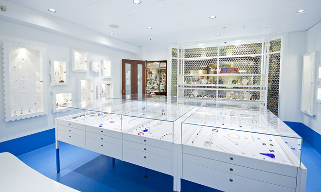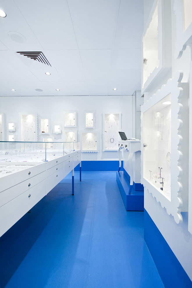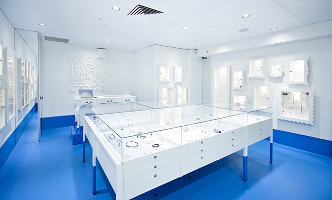 The idea of the store design was simply like the ‘white-on-white’ store was dipped in a pool of blue paint, striking a line across the entire store that made everything blue. This was a way of acknowledging the blue in the name but without compromising the jewellery as colour throw-off can happen and alter looks of stones and metal.
