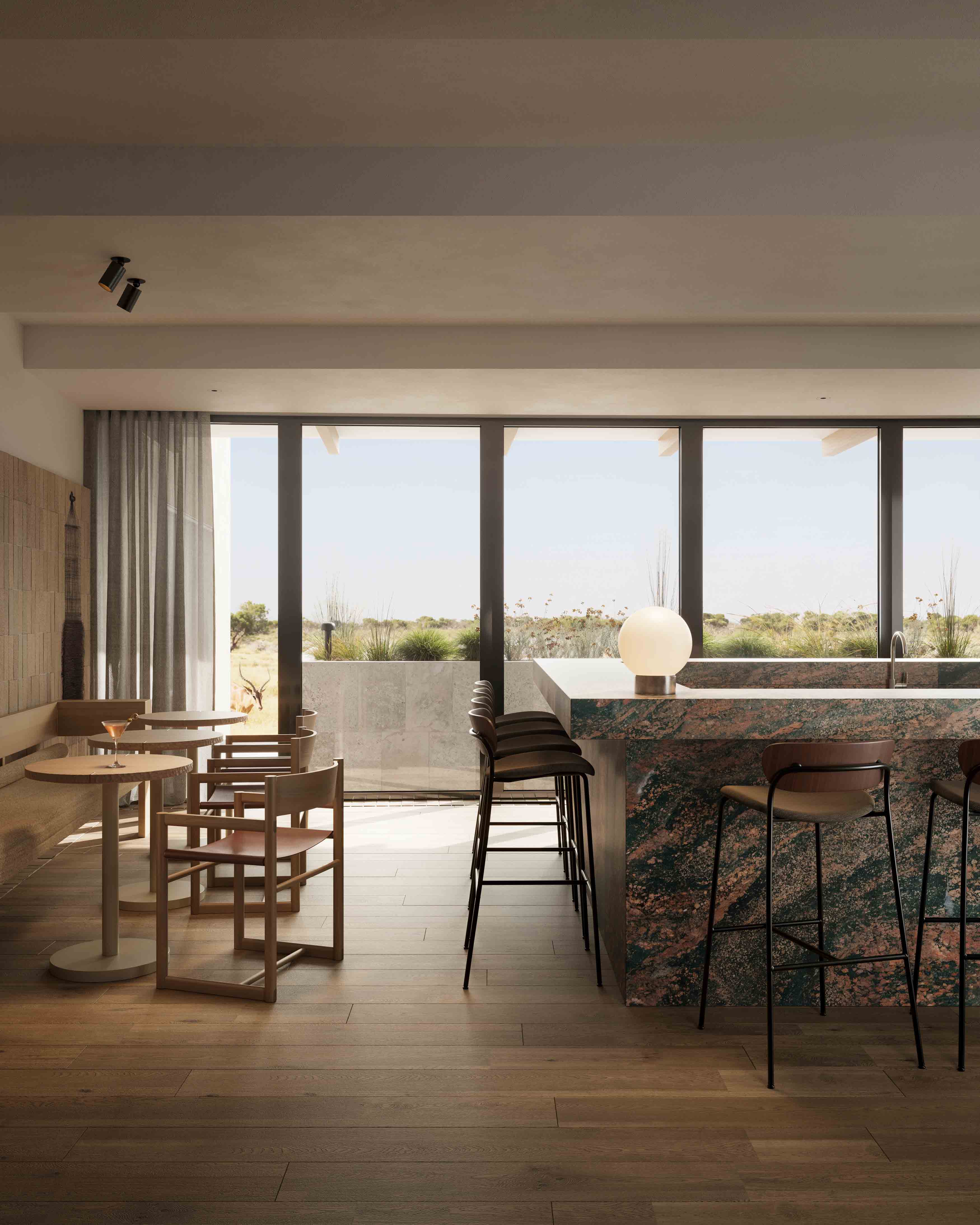 The Monarto Safari Lodge was designed as a calm, textural, and understated luxury space using natural, locally sourced materials and custom joinery. A textural minimal aesthetic creates warmth and timelessness while connecting guests to the landscape without cliché. The space embraces grounded luxury, dusty surroundings and curious roaming wildlife. Thoughtful furniture planning frames views, enhances light and texture, and integrates sustainability through local sourcing and reduced environmental impact.